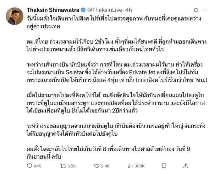 這個説法站不住腳。因為他沒有必要,也從來沒有提前宣佈過自己需要定期到新加坡看醫生——醫生嘛,泰國又不是沒有,在阿努廷上台的前一天突發奇想跑出國看病,這顯然很不正常,會給外界以跑路的聯想,非常不利於他信的人設構建。別説沒必要出國,就算真的病了,真的必須去新加坡才能找郎中,也要往後推一推,等過了這段日子再説。