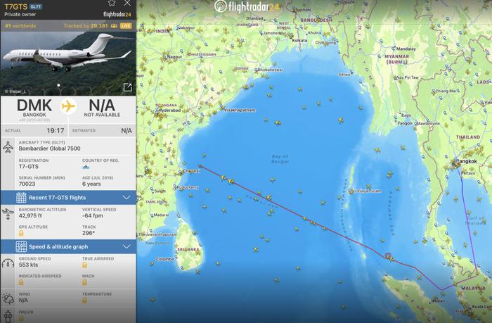 據航班跟蹤網站Flightradar24的信息,當地時間晚上7時17分,這架飛機從曼谷起飛,越過泰國灣,穿過馬來西亞上空。然而,飛機沒有如預期般在飛行兩小時後在新加坡降落,而是突然調轉方向朝西飛去,並在印度洋安達曼海上盤旋了兩圈。隨後,飛機朝迪拜方向飛去。
