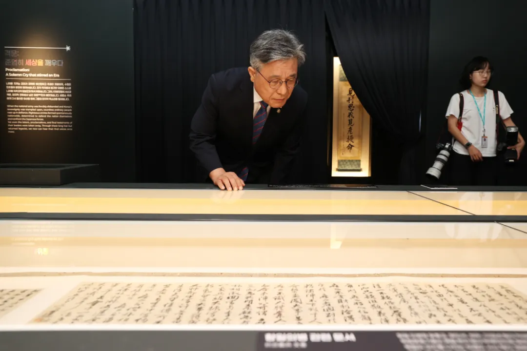 2025年8月11日,韓國文化遺產廳長許敏在特別展覽“承載光輝的抗日遺產”媒體發佈會上查看抗日義兵相關文獻。