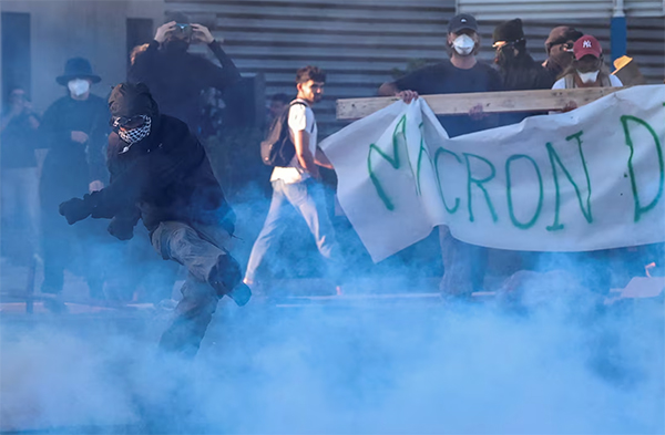 在法國西部城市南特,抗議者用燃燒的輪胎和垃圾桶封鎖高速公路,警方動用催淚瓦斯驅散試圖佔領環島的人羣。
