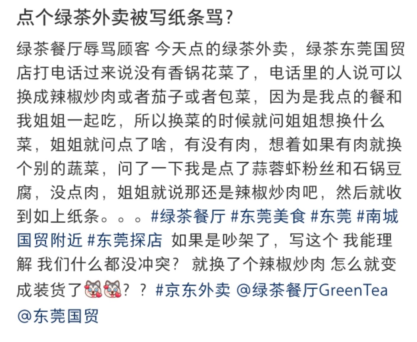 綠茶餐廳外賣驚現辱客字條,外賣業務增長7成卻難掩服務缺陷?
