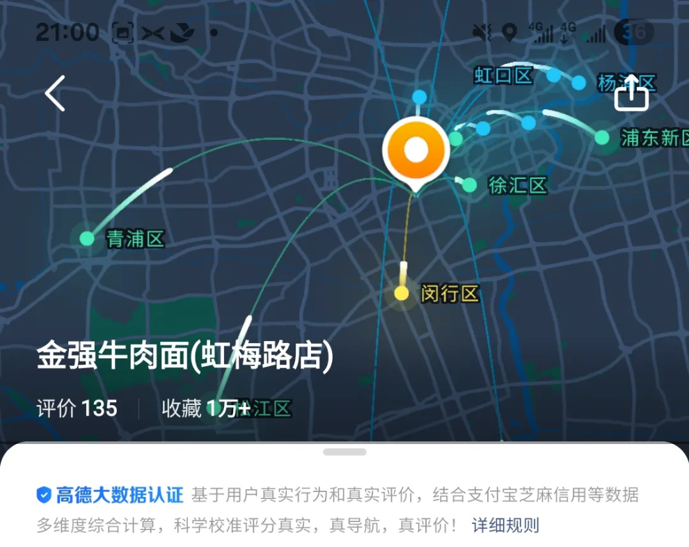例如,根據用户的導航行為,高德地圖可以計算出規模化用户對於某一家餐廳最真實的行動,比如“有沒有去吃過”,“是不是回頭客”,“是不是專程前往”等。 在這種體系下,商家也能夠遠離“刷分換流量”“送禮換好評”等運營潛規則。