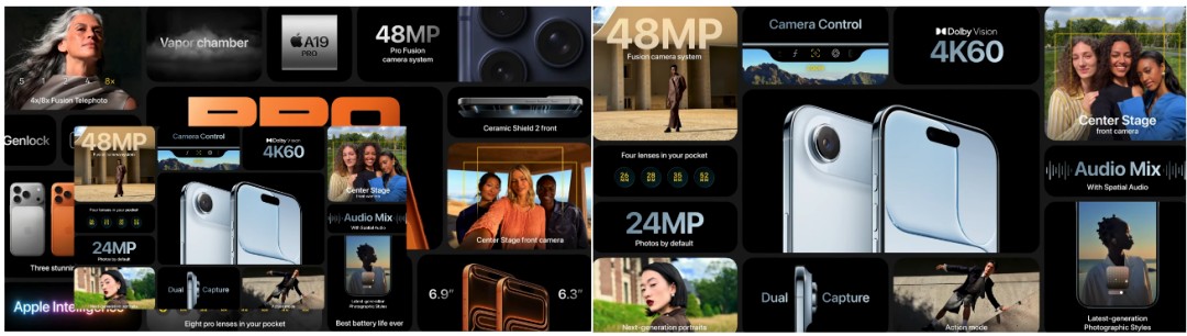 iPhone 17 Pro和iPhone 17 Pro Max採用A19 Pro芯片,蘋果稱這款芯片的性能較A18 Pro提升40%,芯片緩存和內存也進一步增大。後置三攝全部為4800萬像素融合式攝像頭,長焦最高可達等效200mm。