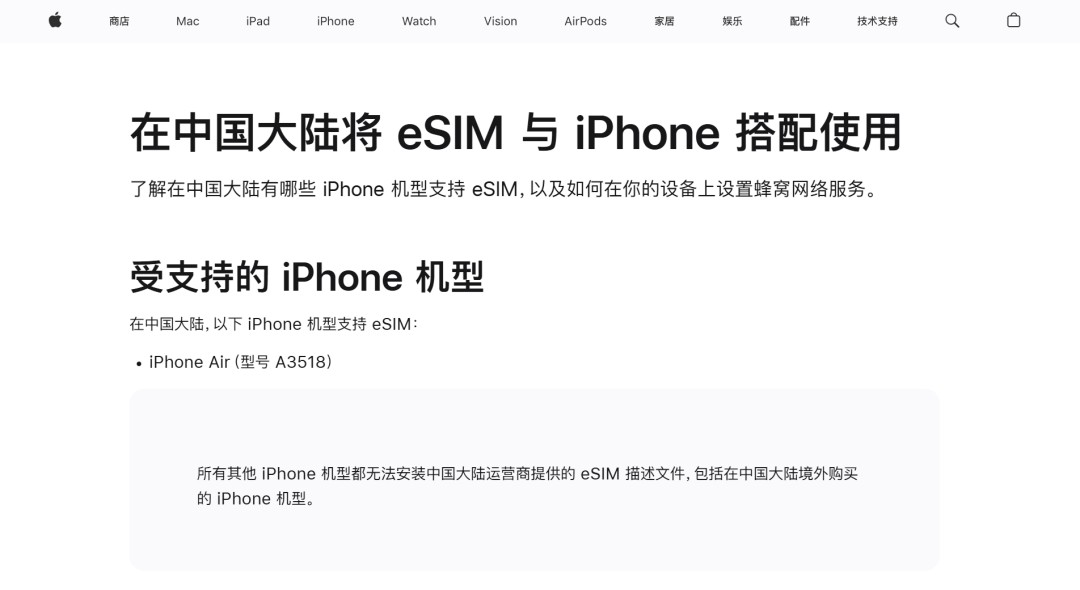 頗受關注的是,由於iPhone Air沒有實體卡槽,所以只能用eSIM。雖然此前官方沒有明確透露消息,但蘋果中國官網顯示,iPhone Air(型號A3518)是目前中國大陸地區唯一支持eSIM的iPhone,同時境外購買的iPhone無法安裝中國大陸運營商提供的eSIM描述文件。