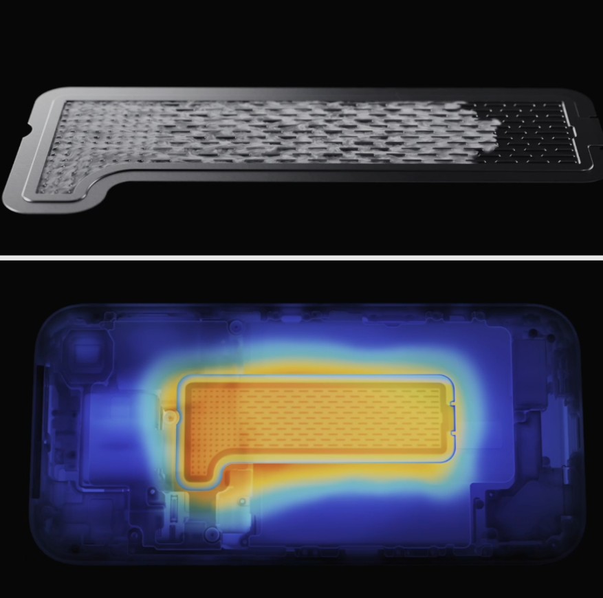 在發佈會中,蘋果重點介紹了散熱性能,全新散熱管理的核心是特別設計的 VC 均熱板 ——特殊的去離子水密封在 VC 均熱板內部,再通過激光焊接在鋁金屬機身內,能有效移走各個組件產生的熱量,從而進一步提升持續性能。VC 均熱板會在整個系統內有計劃地傳導熱量,再經鍛造鋁金屬一體成型機身高效散出,定製的航空級鋁合金熱傳導率是過去鈦金屬的20 倍。