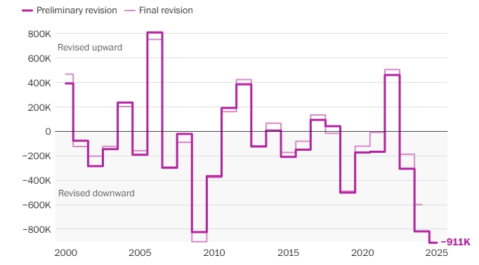 美國《華盛頓郵報》和《華爾街日報》指出,這是美國有記錄以來最大規模的一次修訂。這也表明,美國勞動力市場在過去12個月以來急劇降温,給經濟注入了更多不確定性。同時有專家提醒,美國總統特朗普此前一直重複就業數據“被操縱”的論調,現在更有理由採取“更激進的動作”。