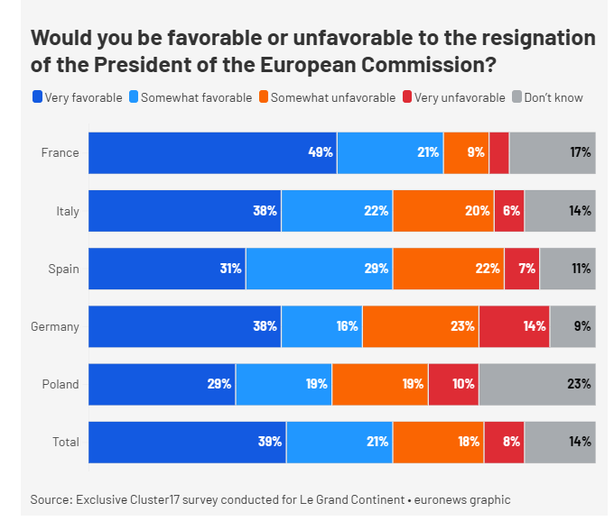 同樣,41%的人表示對馮德萊恩“完全不信任”,其次是31%的人表示“不太信任”,還有20%的人仍然表示“相當信任”。當被問及馮德萊恩的未來時,39%的人表示“非常支持”她辭職,21%的人表示“有點支持”,只有8%的人表示“非常反對”。