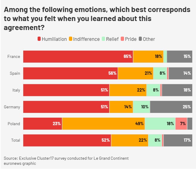 調查顯示,52%的受訪者表示,這項協議讓他們感到“羞辱”,法國(65%)和西班牙(56%)的感受尤為強烈。其中,對美歐貿易協議最不滿的是法國人,有89%的法國人表示批評。