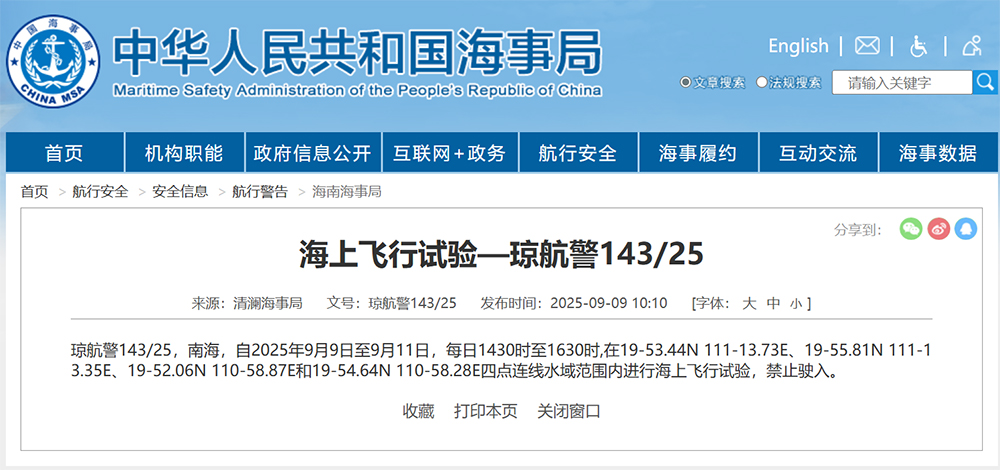 據中國海事局網站消息,9月9日,海南清瀾海事局發佈航行警告,自2025年9月9日至9月11日,每日1430時至1630時,在19-53.44N 111-13.73E、19-55.81N111-13.35E、19-52.06N 110-58.87E和19-54.64N 110-58.28E四點連線水域範圍內進行海上飛行試驗,禁止駛入。
