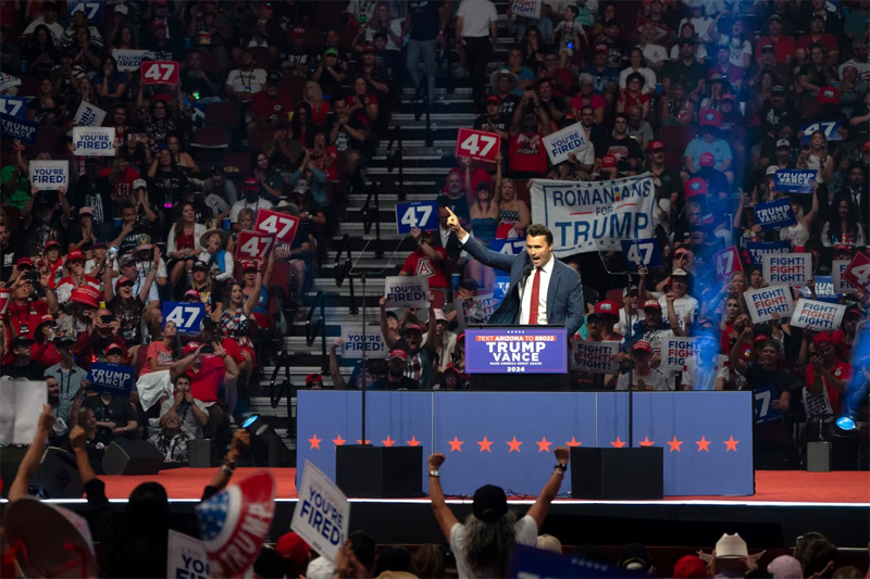 2024年8月,柯克在亞利桑那州格倫代爾沙漠鑽石競技場舉行的特朗普競選集會上發表講話。 CNN
