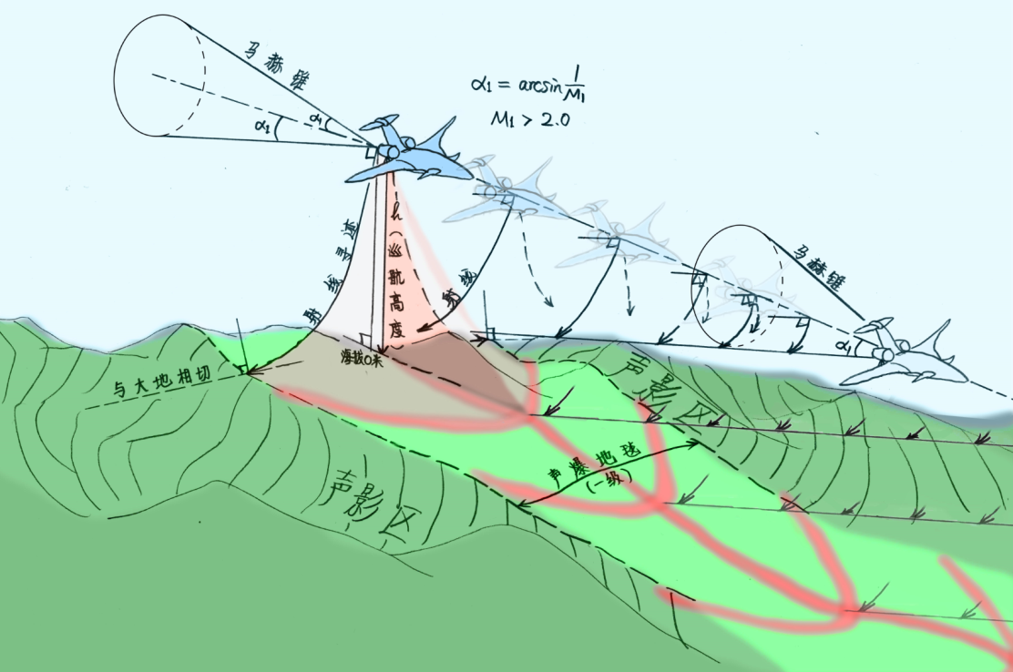 示例1:馬赫數超過2的飛機勻速水平直線掠過,每一時刻向下的各方向聲爆射線折射後,在地面形成弧狀的聲爆邊界。該邊界隨飛機不斷前推,形成帶狀的“聲爆地毯”(與焊縫形狀的形成原理相似),並在這一“走廊”外截斷形成聽不到聲爆的聲影區。