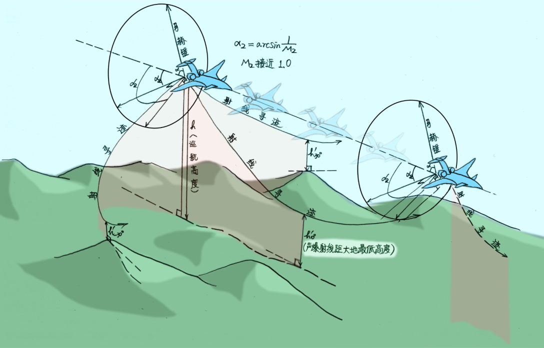 示例2:馬赫數略大於1的飛機從高空勻速水平直線掠過,所有方向的聲爆射線均中途折射迴天空,無一落至地表,聲爆地毯寬度為零(整個地面均為聲影區),發生“馬赫截斷”。