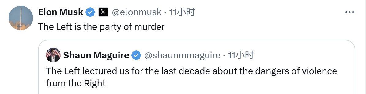 看到風投巨頭紅杉資本的合夥人肖恩·馬奎爾(Shaun Maguire)寫到“左翼十多年來一直宣揚右翼暴力的威脅,但現在危險來自左翼”後,他轉發並回複道,“左翼就是謀殺政黨”。