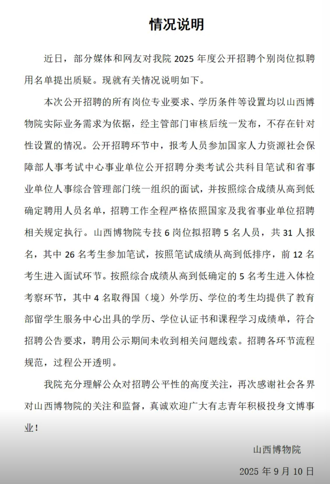 9月10日,針對上述質疑,山西博物院發佈情況説明稱,本次公開招聘的所有崗位專業要求、學歷條件等設置均以山西博物院實際業務需求為依據,經主管部門審核後統一發布,不存在針對性設置的情況。