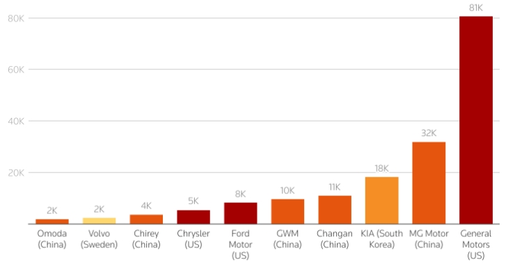 數據顯示,通用汽車是中國對墨西哥最大汽車出口商 路透社製圖