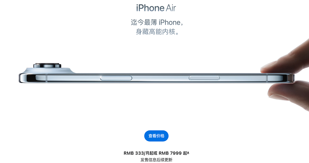 但因為iPhone Air這款新品採用eSIM卡這一特殊設計,它在國內未能與今年的另外三款iPhone同步發售,官網界面顯示“發售信息後續更新”。