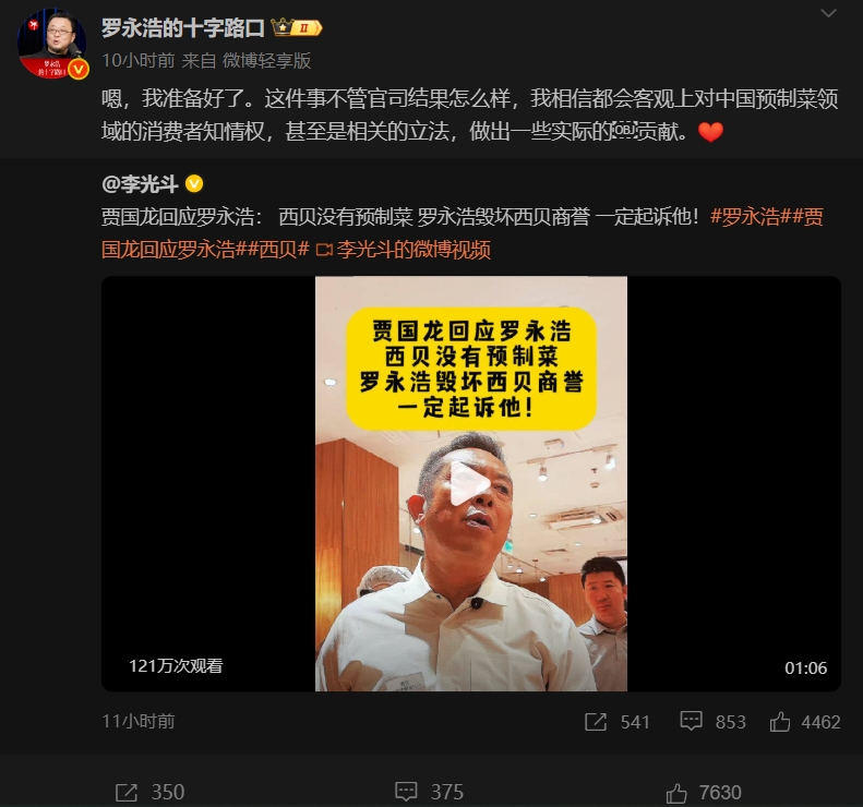 9月11日晚,就西貝創始人、董事長賈國龍表態將起訴羅永浩一事,@羅永浩的十字路口 回覆稱:“嗯,我準備好了。這件事不管官司結果怎麼樣,我相信都會客觀上對中國預製菜領域的消費者知情權,甚至是相關的立法,做出一些實際的貢獻。”