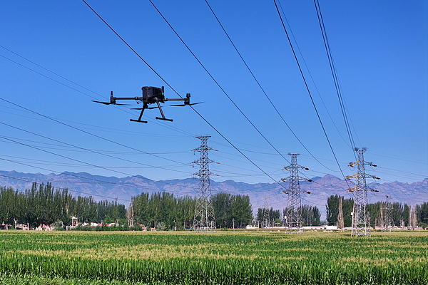 7月21日,國網銀川供電公司員工指揮無人機對金鳳220千伏變電站周邊關鍵輸電線路展開密集巡視與精確紅外測温。視覺中國