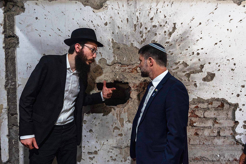 當地時間9月9日,印度孟買,以色列財政部長(右)參觀恐襲紀念碑。視覺中國