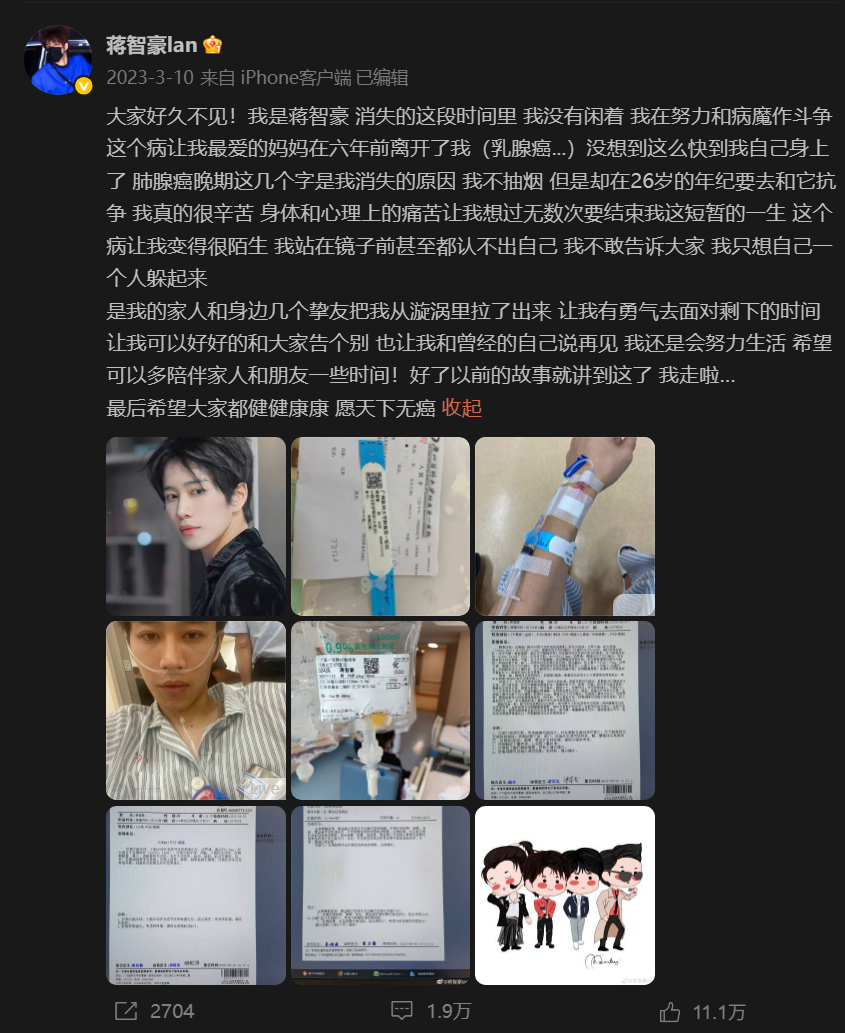 然而,2023年3月10日,蔣智豪在社交平台發帖表示自己已罹患肺腺癌晚期,並因需做治療而一度脱離公眾視線。蔣智豪還透露,自己的母親就是六年前因癌症去世。蔣智豪感嘆,沒想到那麼快自己也患了癌症,明明自己不抽煙,卻在26歲的年紀遭遇身體和心理的痛苦。