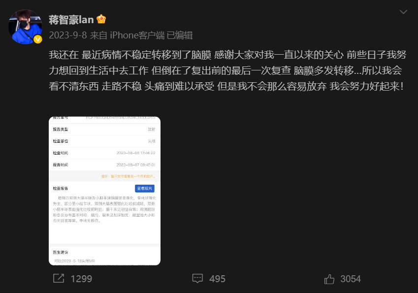 2023年9月,蔣智豪發文稱,自己的病情不穩定,轉移到了腦膜。2024年6月,蔣智豪發聲稱腦膜轉移復發加重,腦實質腫瘤也變成多發。