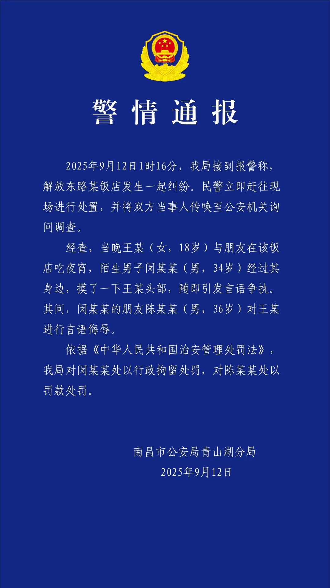 當天稍早時,社交媒體上流傳一段視頻稱,南昌市青山湖區有兩名女子在夜宵店用餐時,其中一名女子遭鄰桌男子無故撫摸頭部。被摸頭的女子當場斥責對方並要求道歉,但對方拒絕道歉且態度囂張,與其同行的綠衣男子還高聲辱罵女子。