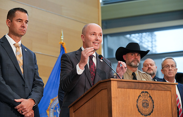 9月12日,美國猶他州州長斯賓塞·考克斯在新聞發佈會上發表講話,宣佈逮捕槍殺查理·柯克的嫌疑人。 視覺中國