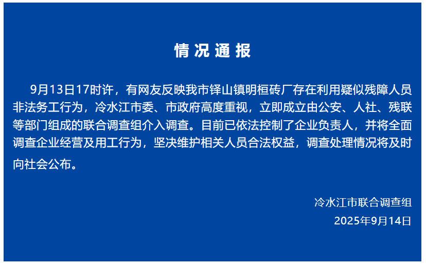 9月13日17時許,有網友反映我市鐸山鎮明桓磚廠存在利用疑似殘障人員非法務工行為,冷水江市委、市政府高度重視,立即成立由公安、人社、殘聯等部門組成的聯合調查組介入調查。目前已依法控制了企業負責人,並將全面調查企業經營及用工行為,堅決維護相關人員合法權益,調查處理情況將及時向社會公佈。