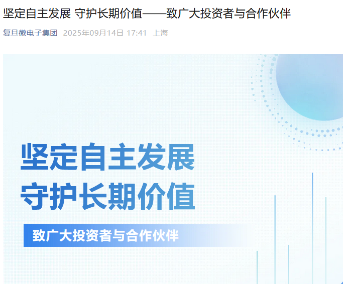 面對美國政府的無理打壓,復旦微電於9月14日晚間通過公眾號發佈了一篇題為《堅定自主發展 守護長期價值——致廣大投資者與合作伙伴》的公開信,疑似對此次被列入“實體清單”一事作出回應。
