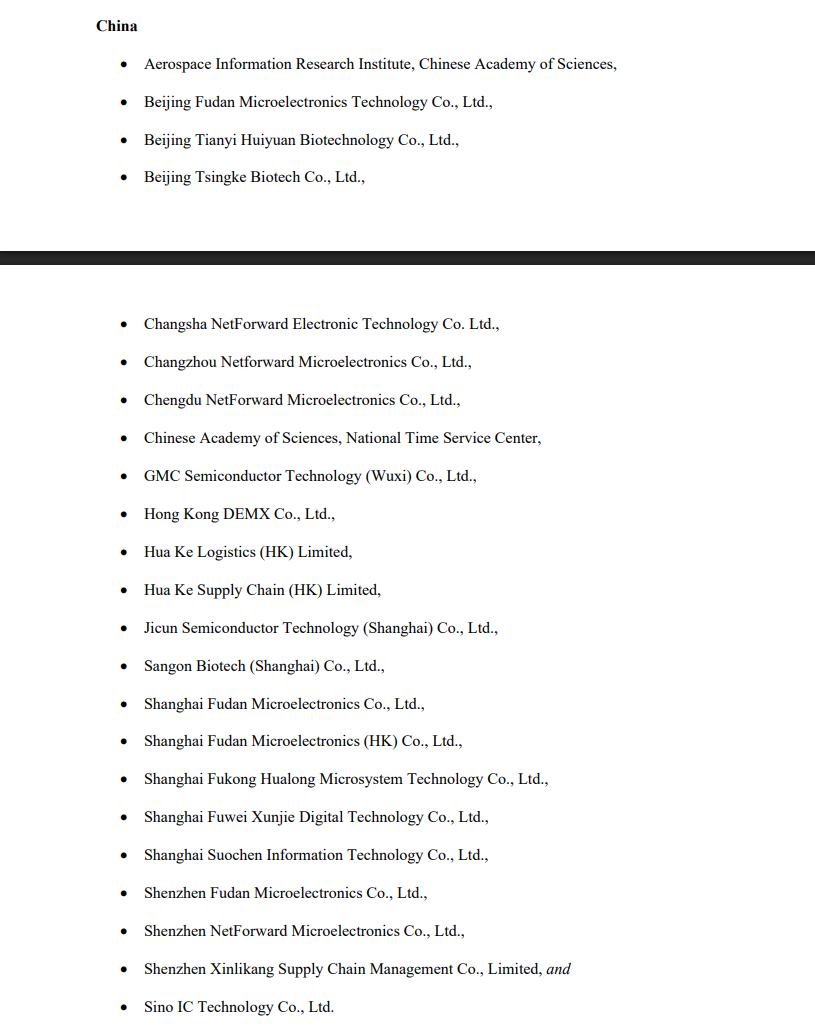 BIS宣稱,這些公司或機構存在“違背美國國家安全或外交政策利益”的行為,包括為中國的先進計算、集成電路製造和分銷部門提供支持,以及參與生物技術、工程軟件開發、半導體制造設備採購等領域,存在規避出口管制、為受制裁對象轉運物項的風險等。