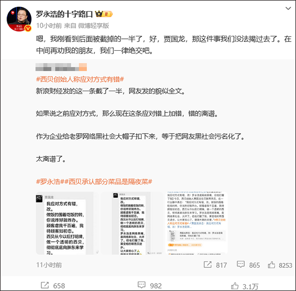 羅永浩深夜再發文,邀西貝賈國龍直播對話