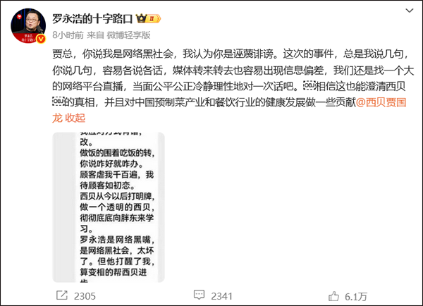 隨後,羅永浩 @西貝創始人賈國龍,並繼續發文稱,這次的事件,總是我説幾句,你説幾句,容易各説各話,媒體轉來轉去也容易出現信息偏差,**我們還是找一個大的網絡平台直播,當面公平公正冷靜理性地對一次話吧。**相信這也能澄清西貝的真相,並且對中國預製菜產業和餐飲行業的健康發展做一些貢獻。