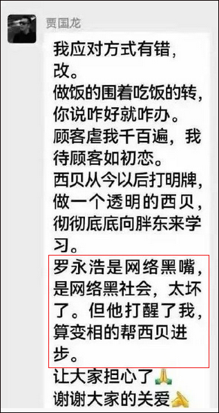 本以為事情告一段落,然而有網友曝光的另一版本截圖顯示,除表示要“打明牌”、向胖東來學習外,賈國龍還在發言中將羅永浩稱為“網絡黑嘴”和“網絡黑社會”。