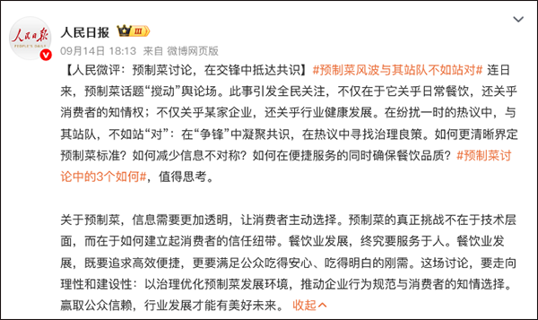 9月14日晚,@人民日報 發佈人民微評稱,關於預製菜,信息需要更加透明,讓消費者主動選擇。預製菜的真正挑戰不在於技術層面,而在於如何建立起消費者的信任紐帶。餐飲業發展,終究要服務於人。餐飲業發展,既要追求高效便捷,更要滿足公眾吃得安心、吃得明白的剛需。這場討論,要走向理性和建設性:以治理優化預製菜發展環境,推動企業行為規範與消費者的知情選擇。贏取公眾信賴,行業發展才能有美好未來。
