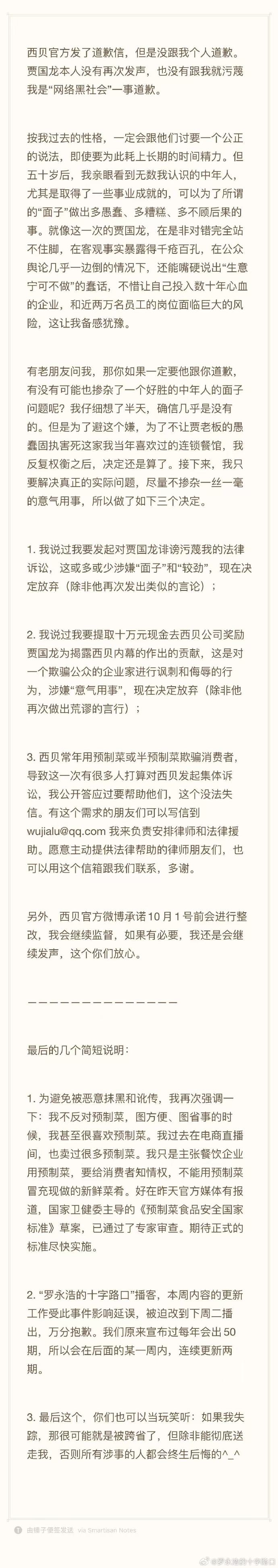 9月15日晚,@羅永浩的十字路口 就與西貝莜麪村的爭議再次發文。