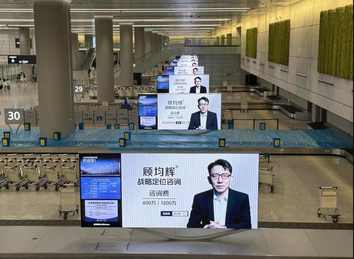 一段時間以來,自稱“定位專家”的顧均輝在機場大面積投放廣告,也引發不少輿論吐槽,其廣告中聲稱“戰略定位”服務價格為600萬-1200萬/年。顧均輝早年間並不像華與華一般名聲響亮,直到最近幾年才在抖音等短視頻平台異軍突起。