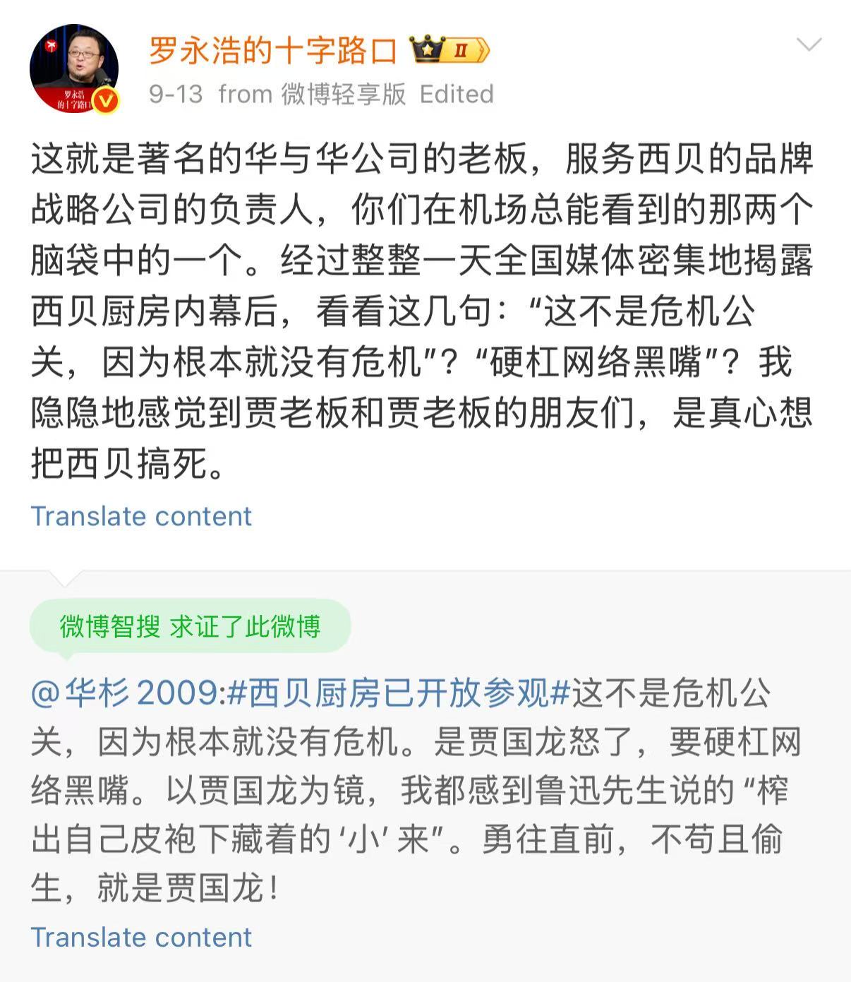9月13日,羅永浩轉發了華杉的微博稱,“這就是著名的華與華公司的老闆,服務西貝的品牌戰略公司的負責人,你們在機場總能看到的那兩個腦袋中的一個……”