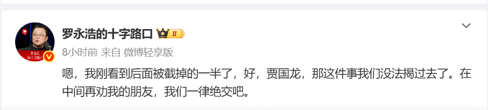 14日深夜,羅永浩發微博回應:“賈國龍,這件事我們沒法揭過去了。再勸我的朋友,一律絕交。”