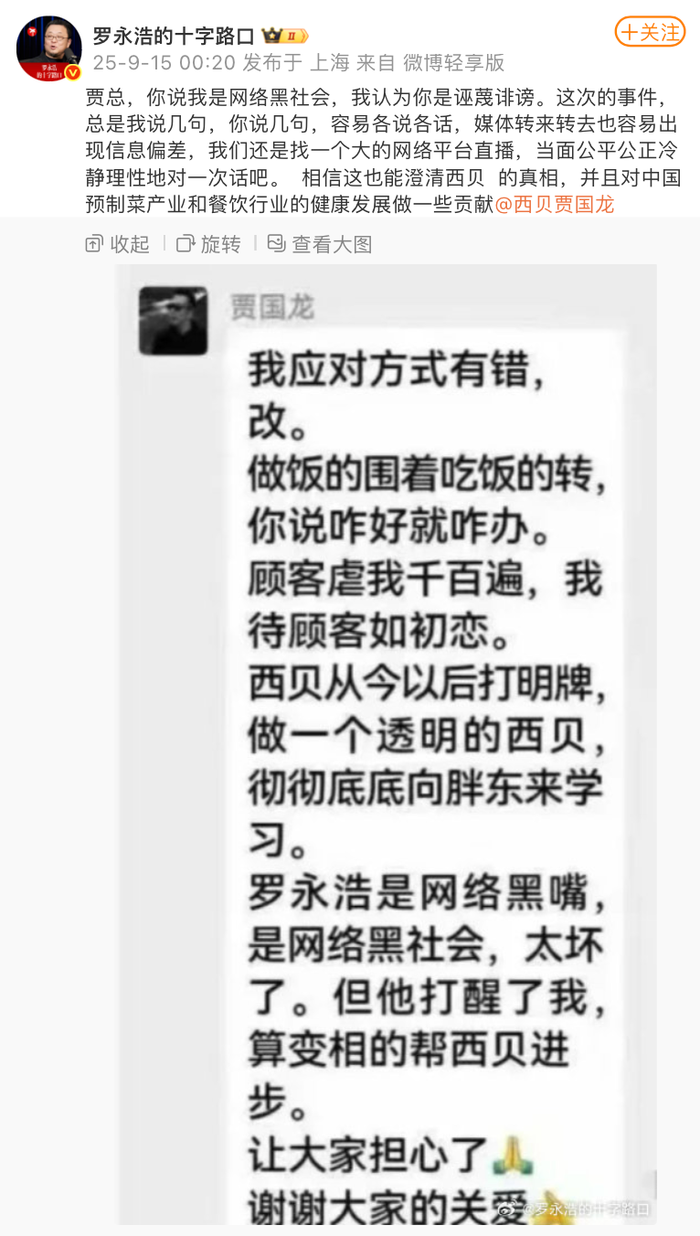 15日凌晨,羅永浩再發微博,呼籲賈國龍與自己公平、公正、冷靜、理性地進行一次對話。西貝發佈致歉信後,羅永浩轉發並質疑:“顧客虐你什麼了?顧客都被你打成網絡黑社會了,誰虐誰呢?百分之百沒有預製菜的虛假承諾呢?拿預製菜假裝不是預製菜的税率差異呢,要不要給公眾攤開講講?10月1號開始替換,所以你10月1號前還要繼續賣剩菜是嗎?加了很多科技狠活兒腥氣撲鼻的海鱸魚呢……”