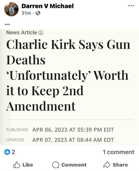 聲明沒有提到邁克爾發佈的帖文內容。但一些美國網民的截圖顯示,用户名為“達倫·V·邁克爾”、簡介為“APSU教授”的Facebook賬號轉發了美國《新聞週刊》2023年的一篇報道,其標題為“查理·柯克説,為了維護憲法第二修正案,不幸發生槍擊死亡是值得的”。