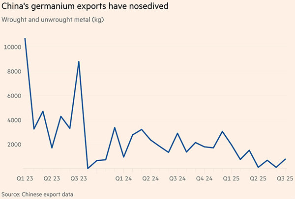 《金融時報》指出,自2024年年底起,中國鍺出口量開始急劇下降。與稀土元素一樣,鍺在全球範圍內並非絕對稀缺,但其開採與提煉在經濟和技術層面極具挑戰,通常只能作為鋅和煤灰的副產品產出。俄羅斯曾是西方重要的鍺供應國,但自俄烏衝突爆發後,西方對俄的制裁導致鍺供應出現短缺。