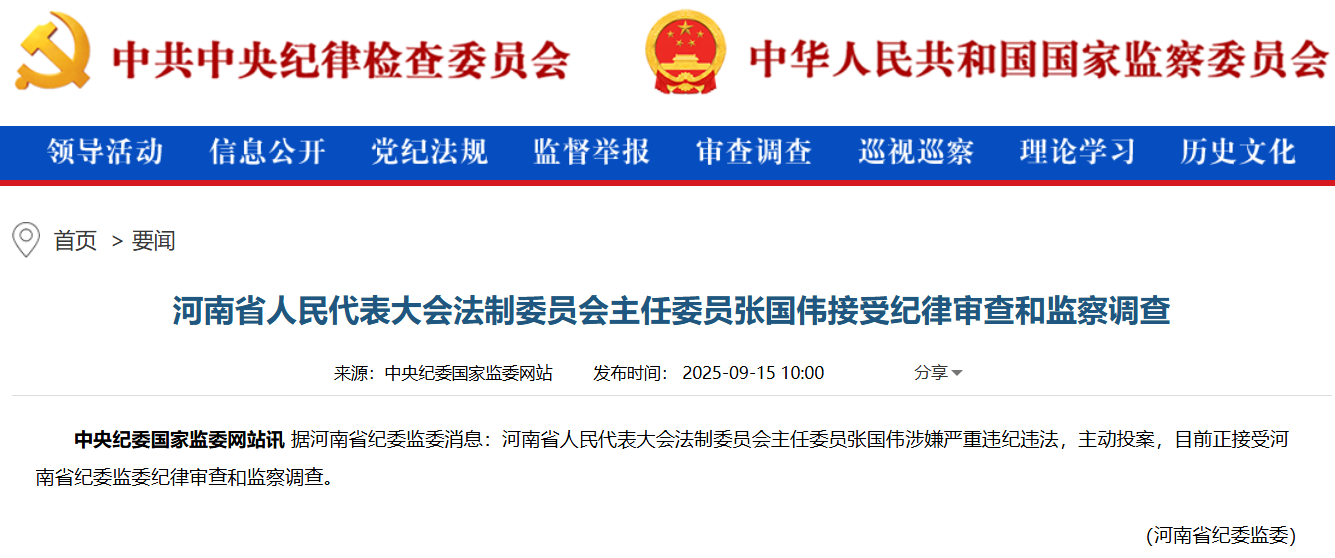 據中央紀委國家監委網站9月15日消息,據河南省紀委監委消息:河南省人民代表大會法制委員會主任委員張國偉涉嫌嚴重違紀違法,主動投案,目前正接受河南省紀委監委紀律審查和監察調查。