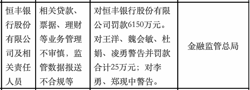 國家金融監督管理總局的行政處罰信息公示列表顯示,因相關貸款、票據、理財等業務管理不審慎,監管數據報送不合規等,恆豐銀行被罰款6150萬元。同時,對王洋、魏會敏、杜娟、凌勇警告並罰款合計25萬元,對李勇、鄭現中警告。
