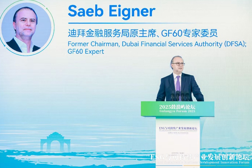 迪拜金融服務局原主席、GF60專家委員Saeb Eigner以“跨國協作:構建韌性與低碳的貿易通道”為題發表主旨演講。他指出,可持續貿易與氣候治理亟需全球協作,不僅能降低成本,還能激發創新。治理框架應緊密銜接貿易流動、氣候目標與投資標準。未來,全球合作及治理需要多方建立聯繫並加強互信,因為信任、透明與標準是全球綠色貿易互利的前提,也與中國的互利共贏理念相吻合。