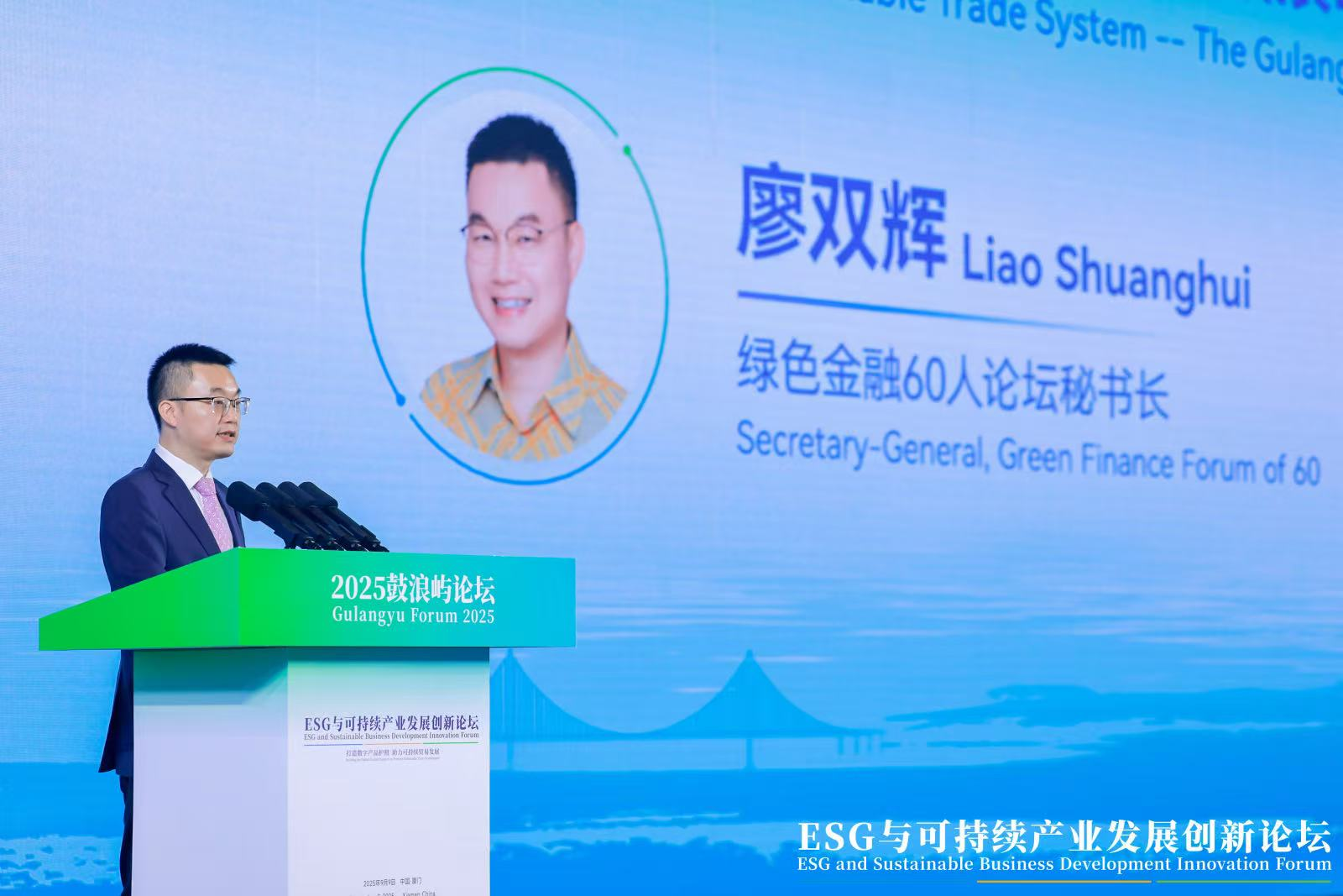 論壇現場重磅發佈《共築未來國際可持續貿易體系——鼓浪嶼倡議》,倡議內容由綠色金融60人論壇秘書長廖雙輝宣讀。