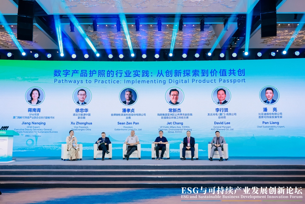 圓桌對話二聚焦“數字產品護照的行業實踐:從創新探索到價值共創” 主題。GF60首席經濟學家、廈門海峽可持續產業研究院院長張俊傑做圓桌引導,重點分析了國際貿易中的關税與非關税壁壘、歐盟DPP政策法規進展、中國DPP框架建設以及跨國供應鏈信息披露面臨的挑戰。圓桌對話由GF60專家、廈門海峽可持續產業聯合會執行副秘書長蔣南青主持。道達爾能源中國副總裁徐忠華,金牌廚櫃家居科技股份有限公司總裁潘孝貞,陶朗集團亞洲區公共事務副總裁、歐盟商會環境工作組主席常新傑,友達光電(廈門)有限公司總經理李行賢,以及比亞迪股份有限公司首席可持續發展專家潘亮各自從能源、製造、家居、光電及汽車等行業視角出發,深入探討了數字產品護照在產業創新實踐、跨部門協作、綠色供應鏈建設及價值共創等方面的應用經驗與前沿案例,為推動數字產品護照在不同行業的落地與發展提供了豐富啓示。