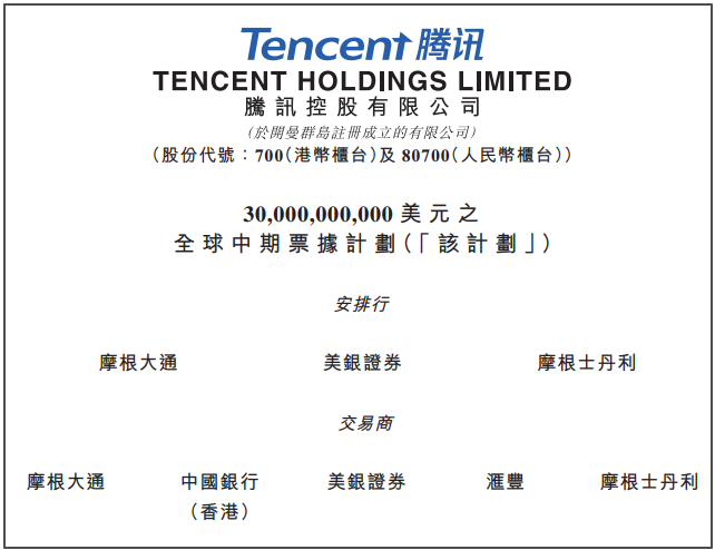 根據港交所公告,騰訊已經申請了一項總額高達300億美元的全球中期票據計劃,該計劃將於9月16日正式生效,有效期持續12個月。公司表示擬運用發行所得款項淨額作為一般企業用途。
