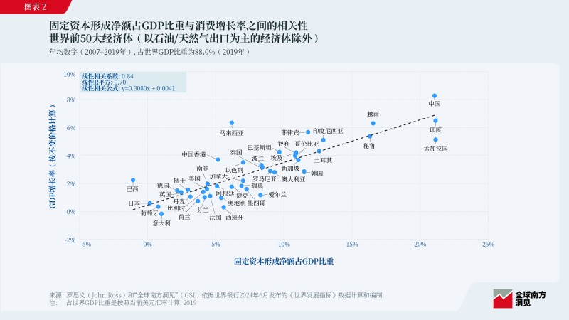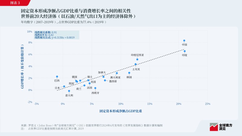 固定資本形成淨額佔GDP比重與消費增長高度相關,且經濟規模越大相關性越強