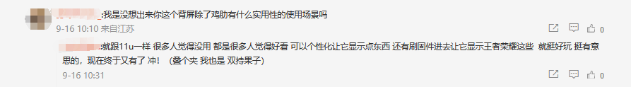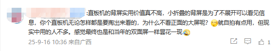 也有網友分析道:“直板機的背屏實用價值真不高,小摺疊的背屏是為了不展開可以看見信息,你個直板機無論怎樣都是要掏出來看的,為什麼不看正面的大屏呢? 就自拍有點用,但實際中用的人不多。感覺最終也是和當年的雙面屏一樣曇花一現。”