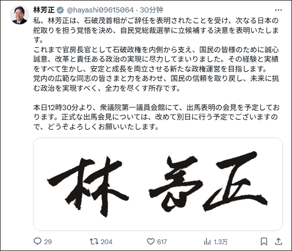 林芳正表示,在擔任日本官房長官期間,他全力支持石破茂政府,積極推進改革與負責任的政治。未來,他將充分運用自身經驗,致力於推動兼顧政局穩定與經濟增長的新政權運作,重建國民信任,面向未來。